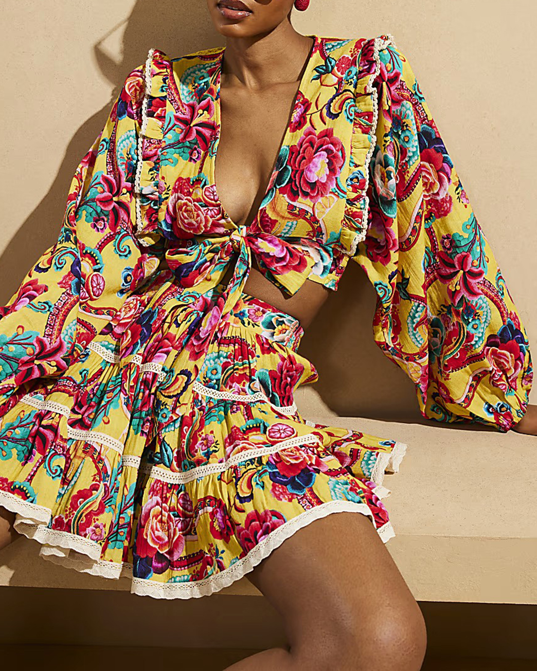 Yellow Cotton Art Print Pleated Skirts
